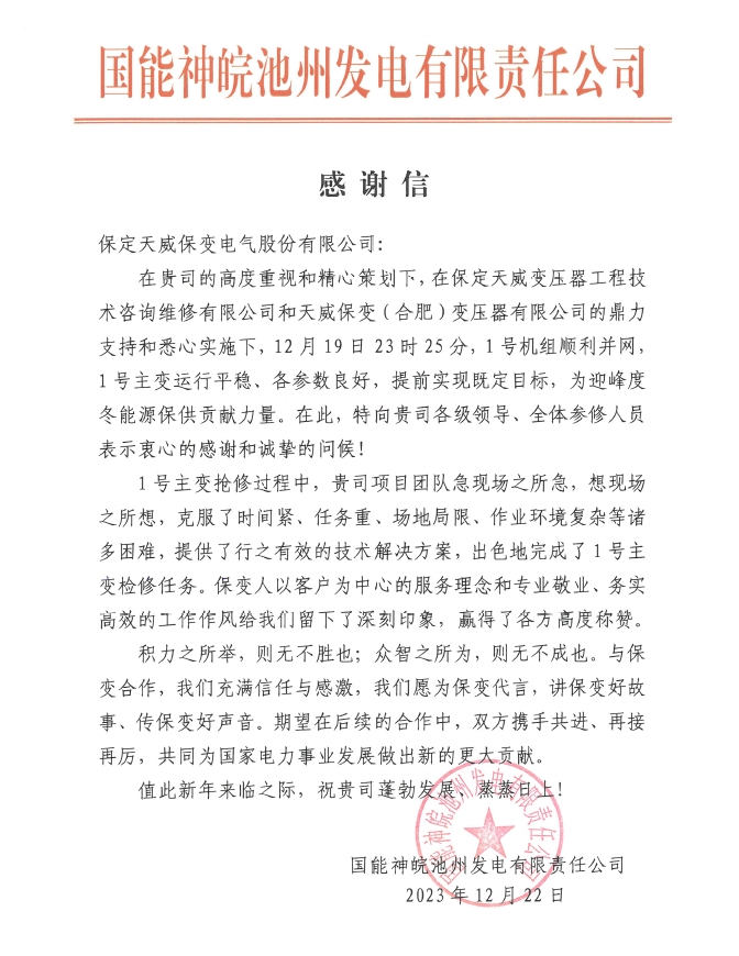 12月22日,国能神皖池州发电有限责任公司向合变公司发来感谢信,用真挚的语言和深切的感情对保变电气维...