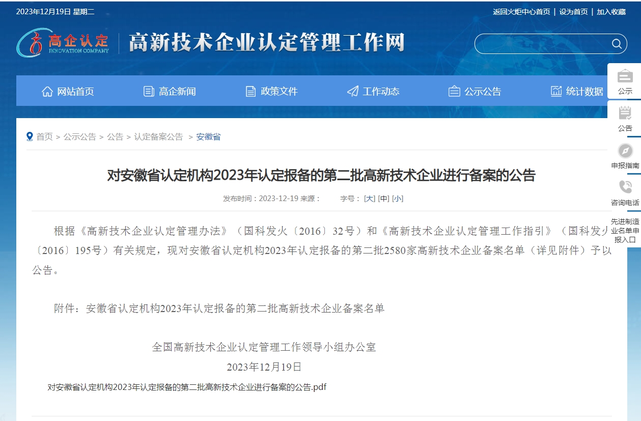 近日,全国高新技术企业认定管理工作领导小组办公室公布了《安徽省认定机构2023年认定的第二批高新技术企业...